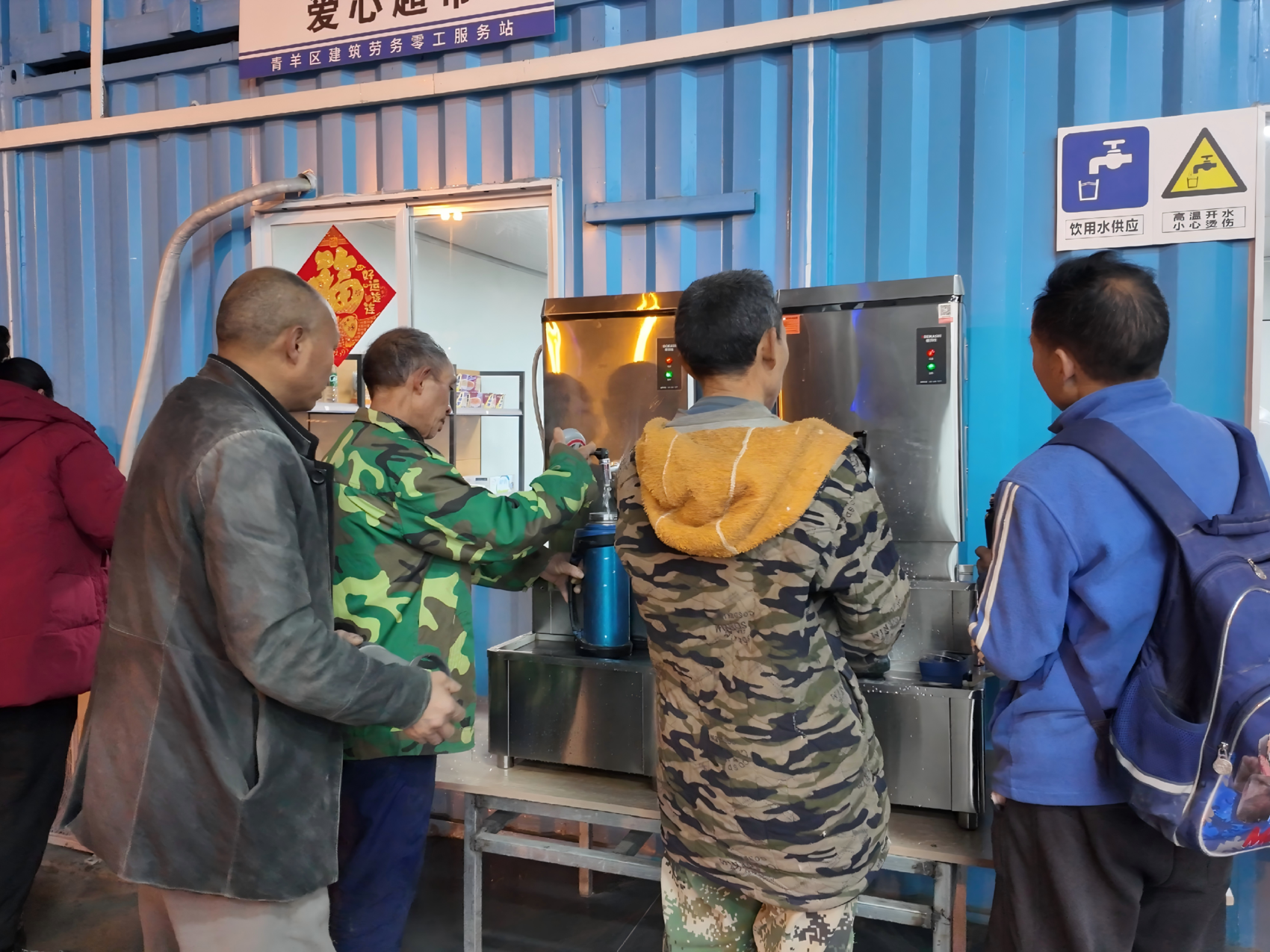 工人们接热水。
