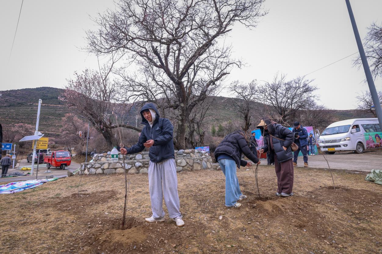 当天,植树活动现场一派热火朝天。大家分工协作,扶苗、填土、浇水,每道工序都做得认真细致。现场专门设置了“杏运树”树苗领取区,游客可免费认领专属树苗,亲手栽种后,还能为树苗挂上刻有心愿的专属挂牌。来自成都的游客李女士和家人一起种下一棵杏树,并在牌上写下“愿家人平安,与道孚再相逢”的心愿。“在盛开的杏花林边再添新绿,这个春天来得特别有意义。”她说。