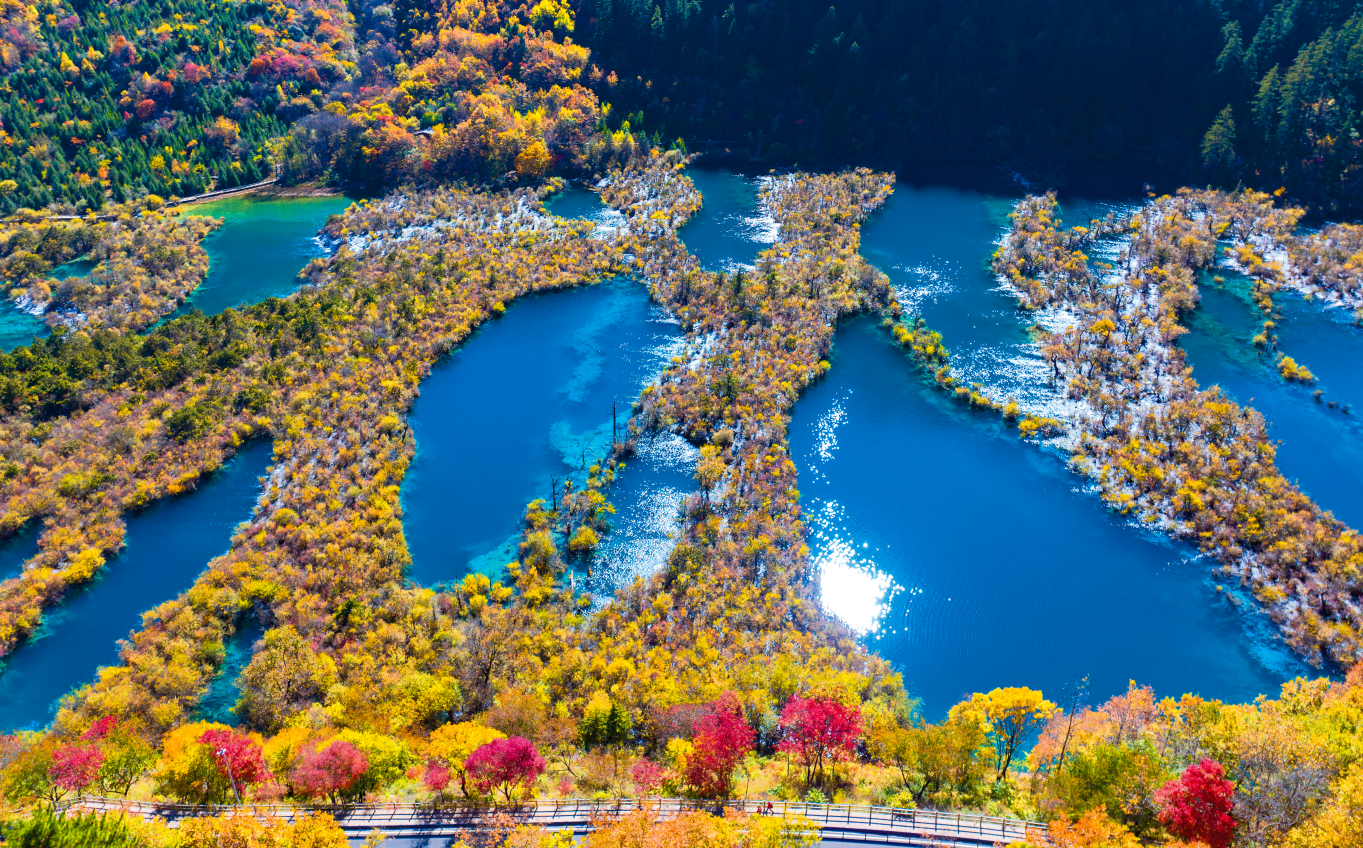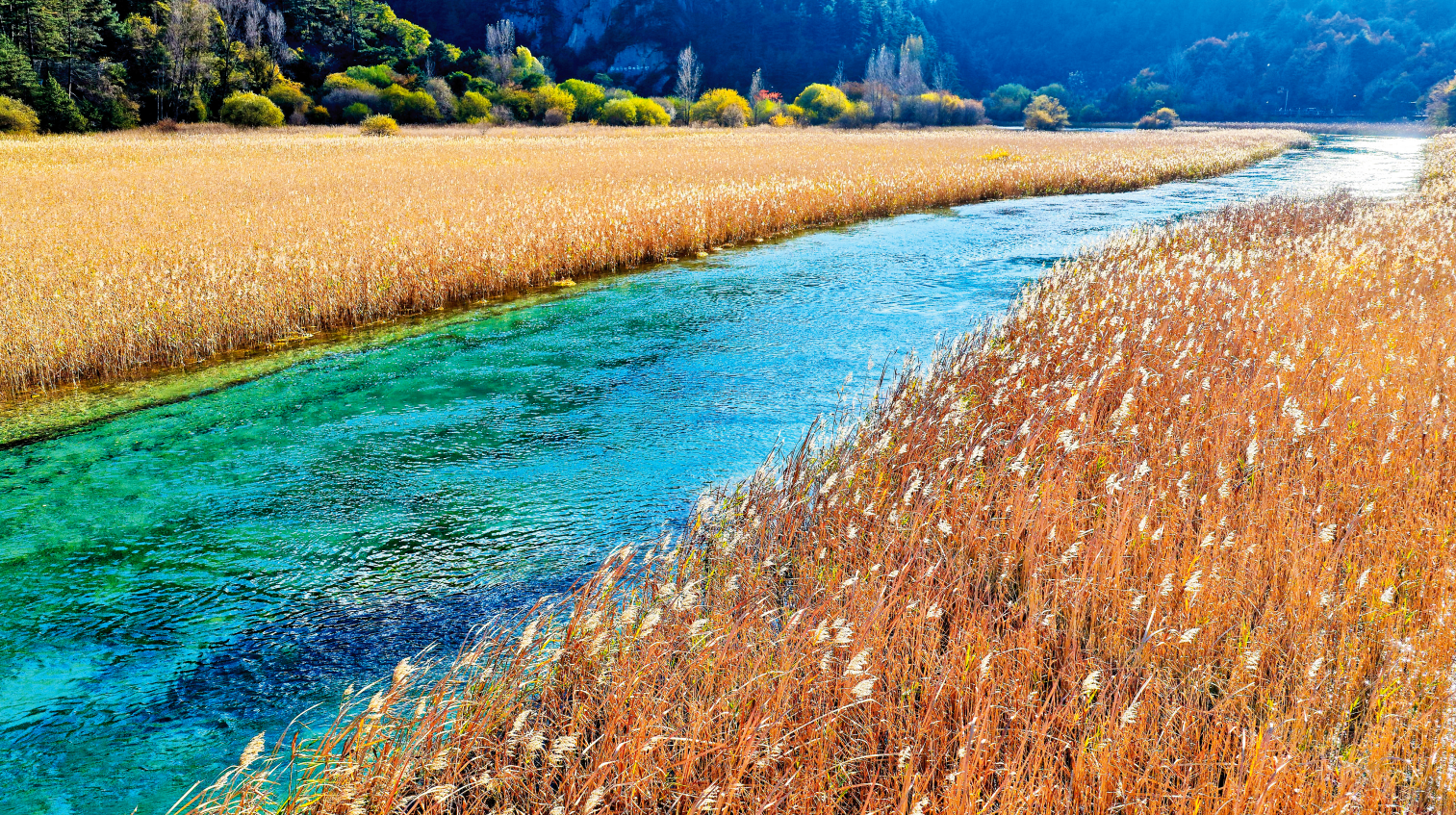 五花海好似灵动的川妹子,湖底钙华沉积、腐殖质与矿物质在阳光折射下,交织出蓝、绿、黄、橙的斑斓光影。秋日更是盛装出场——彩林倒映湖中,虚实交融,宛如大自然挥就的水彩长卷。这般景致并非偶然,唯有森林、湿地、湖泊系统健康运转,方能外化如此生机。