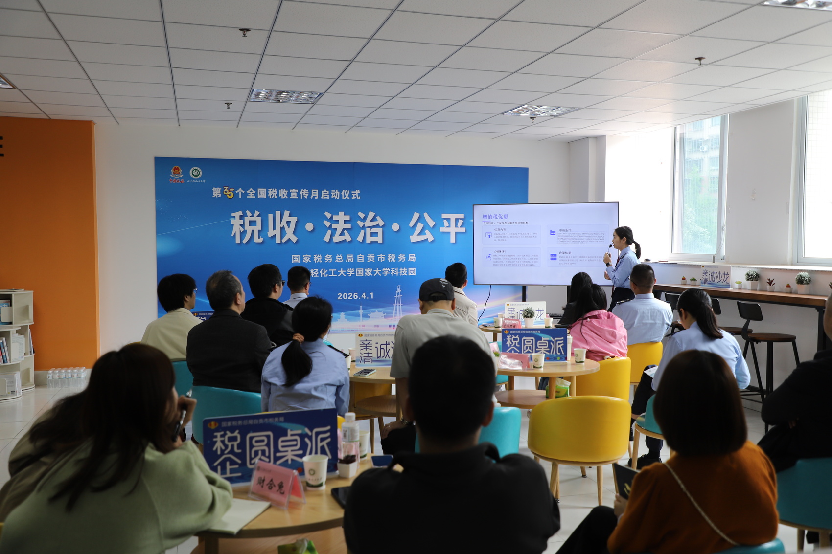 在四川轻化工大学国家大学科技园内,税收宣传月启动仪式暨“亲清税企沙龙”同步举行。这里瞄准的是自贡中小市场主体发展的“最初一公里”——园区依托高校资源,已集聚食品轻工、化工新材料、电子信息、智能制造等领域的70余家科技型中小企业,其中超七成处于初创阶段。