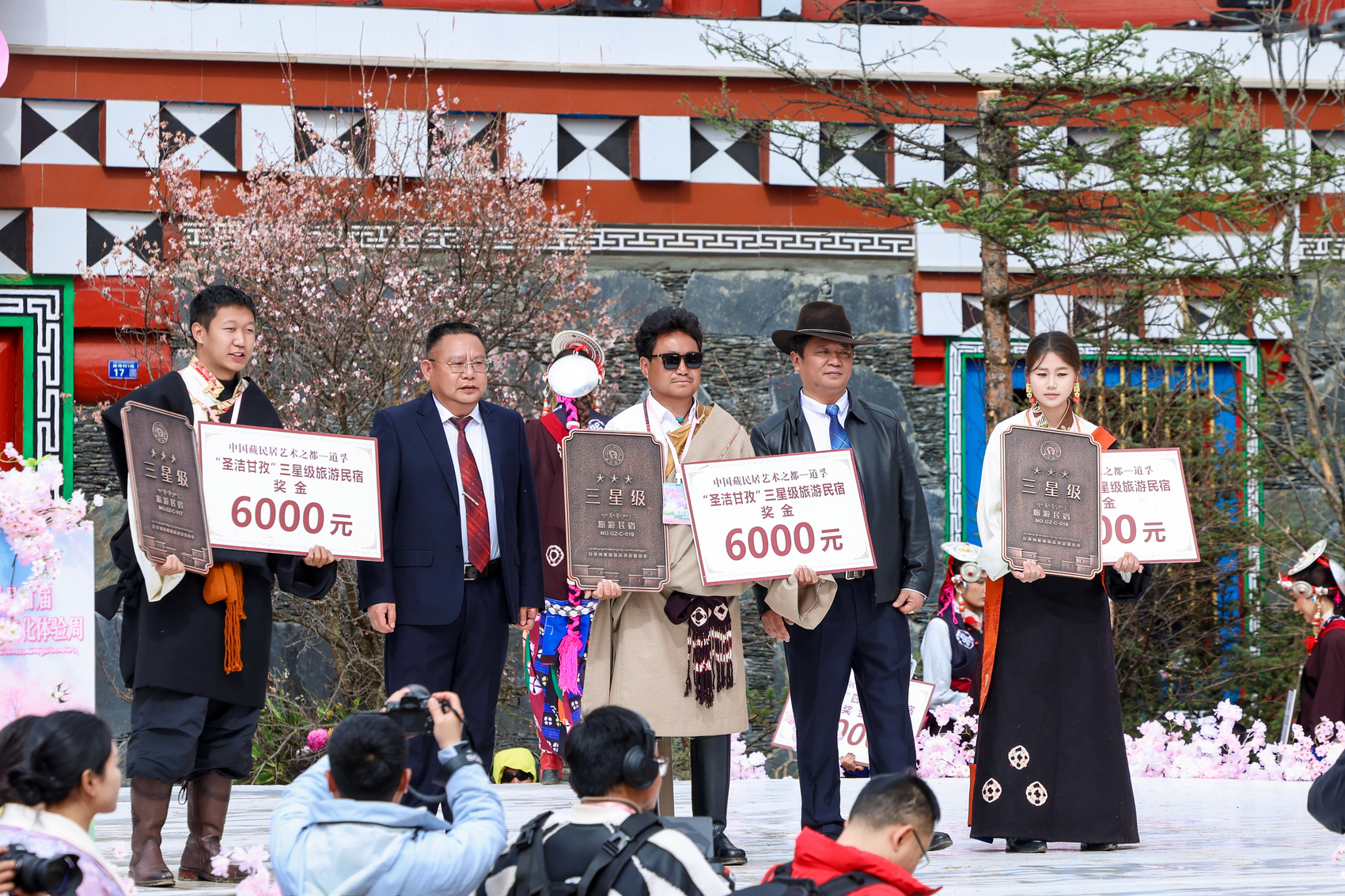 开幕式现场还举行了多项授牌与颁奖仪式。当地为圣洁甘孜旅游民宿获奖单位、县内金马、银马、铁马民宿获评单位,以及国家二级图书馆、玉科草原生态旅游示范区创建单位颁奖,以标杆引领带动民宿产业规范化、特色化发展。现场还完成多项合作授牌:广州亚生园艺为甲斯孔乡授予“花枝供应基地”称号,中国汽车摩托车运动联合会为道孚相关企业授牌“汽车自驾运动营地”,并为县文广旅局授予“丹道秘境·川藏溯源”精品自驾运动游线路称号,道孚县非遗工坊也在当天正式开园。