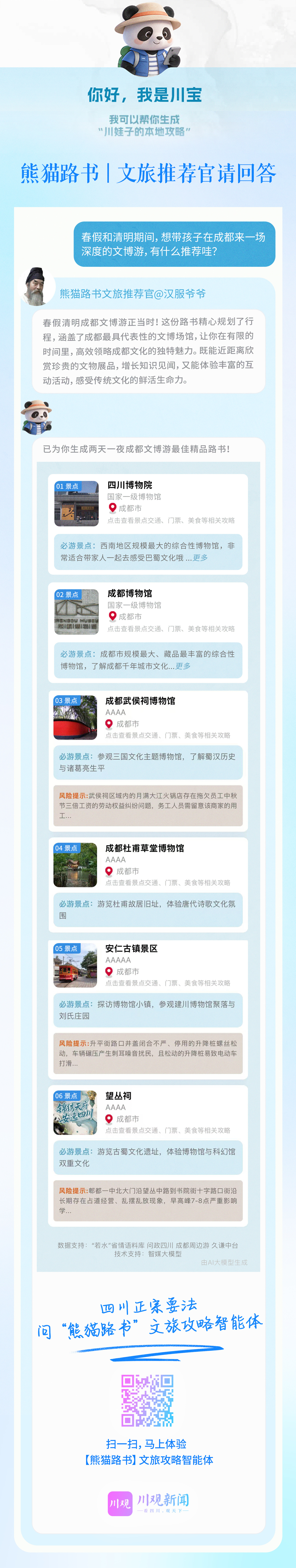 熊猫路书温馨提示:清明假期出行高峰,川西花海、自贡灯会、峨眉山等热门地建议提前3天预约门票与住宿,错峰出行更舒心。