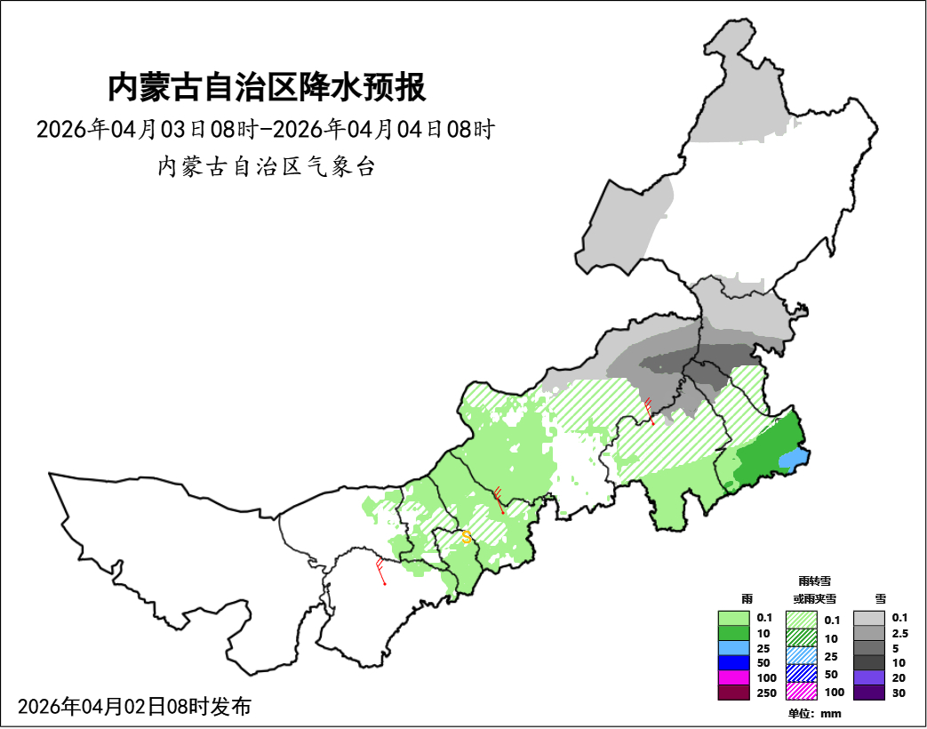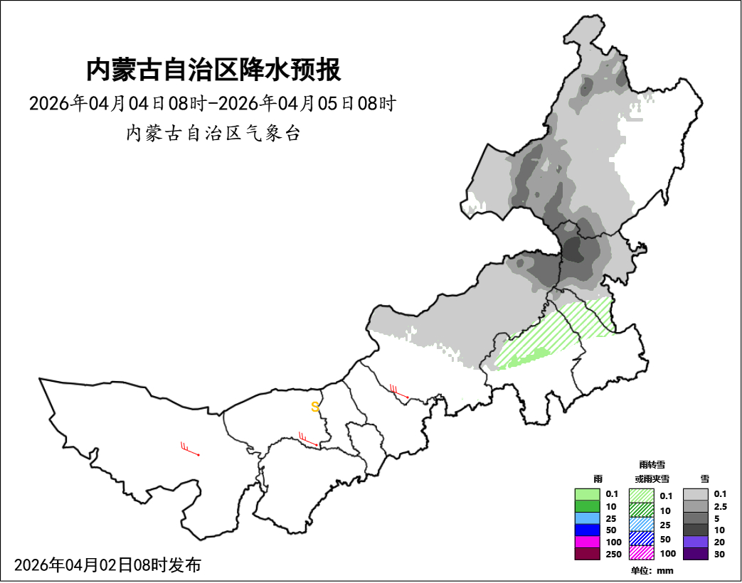 预计未来三天(4月2日-4日)天气格局将迎来转变,较强冷空气上线,带来大风、降温、雨雪天气。西部偏东北、中东部大部地区,以小雨、雨夹雪或小雪为主,其中锡林郭勒盟东北部、通辽市西北部、兴安盟西部和南部、赤峰市东北部、呼伦贝尔市西部部分地区有中到大雪,通辽市南部有中雨,局地有大雨。中西部大部地区多大风、沙尘在线,将出现5、6级风,局地阵风可达9级以上。同时气温骤降,部分地区降幅超10℃。恰逢清明假期,冷空气活动频繁,公众出行请注意防寒保暖,及时增添衣物。