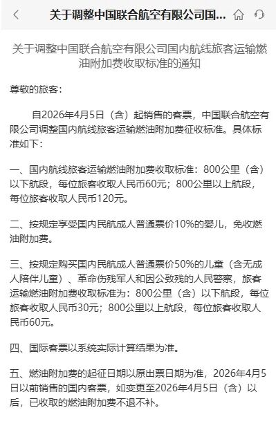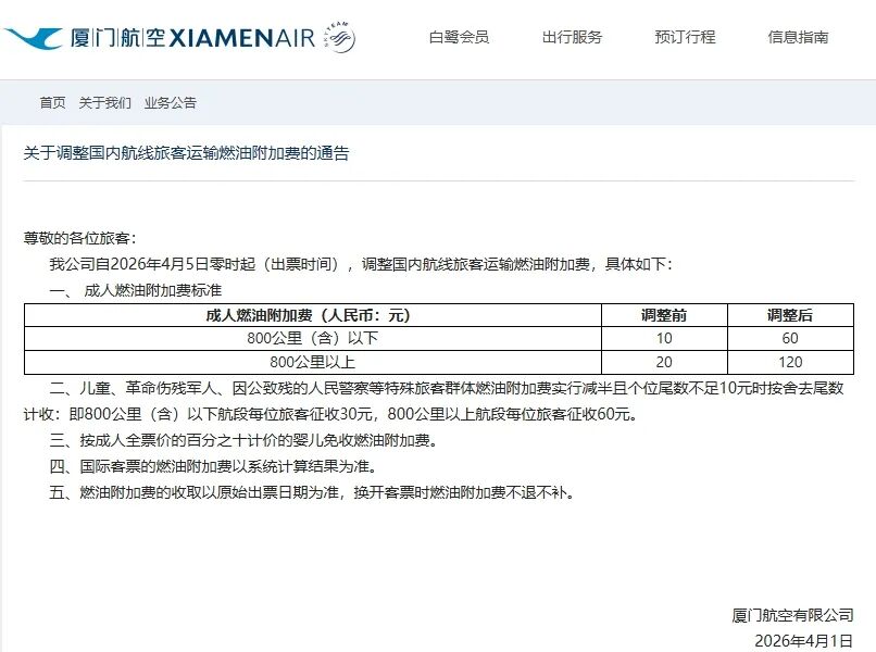 4月1日,厦门航空官网、中国联合航空公司分别发布通知,将于2026年4月5日零时起(出票时间),调整国内航线旅客运输燃油附加费。
