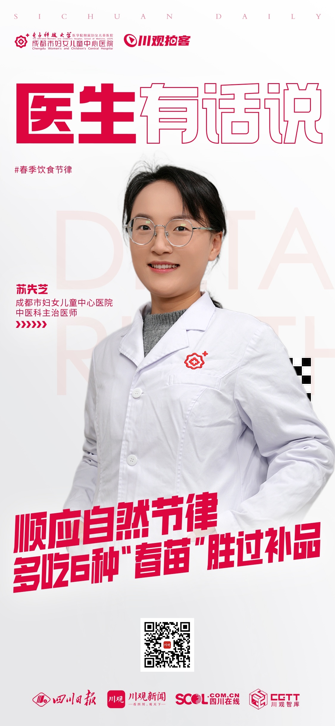 本期栏目,来自成都市妇女儿童中心医院中医科的主治医师苏先芝,就跟大家说一说春天适合食用的6种“春苗”以及食用建议。