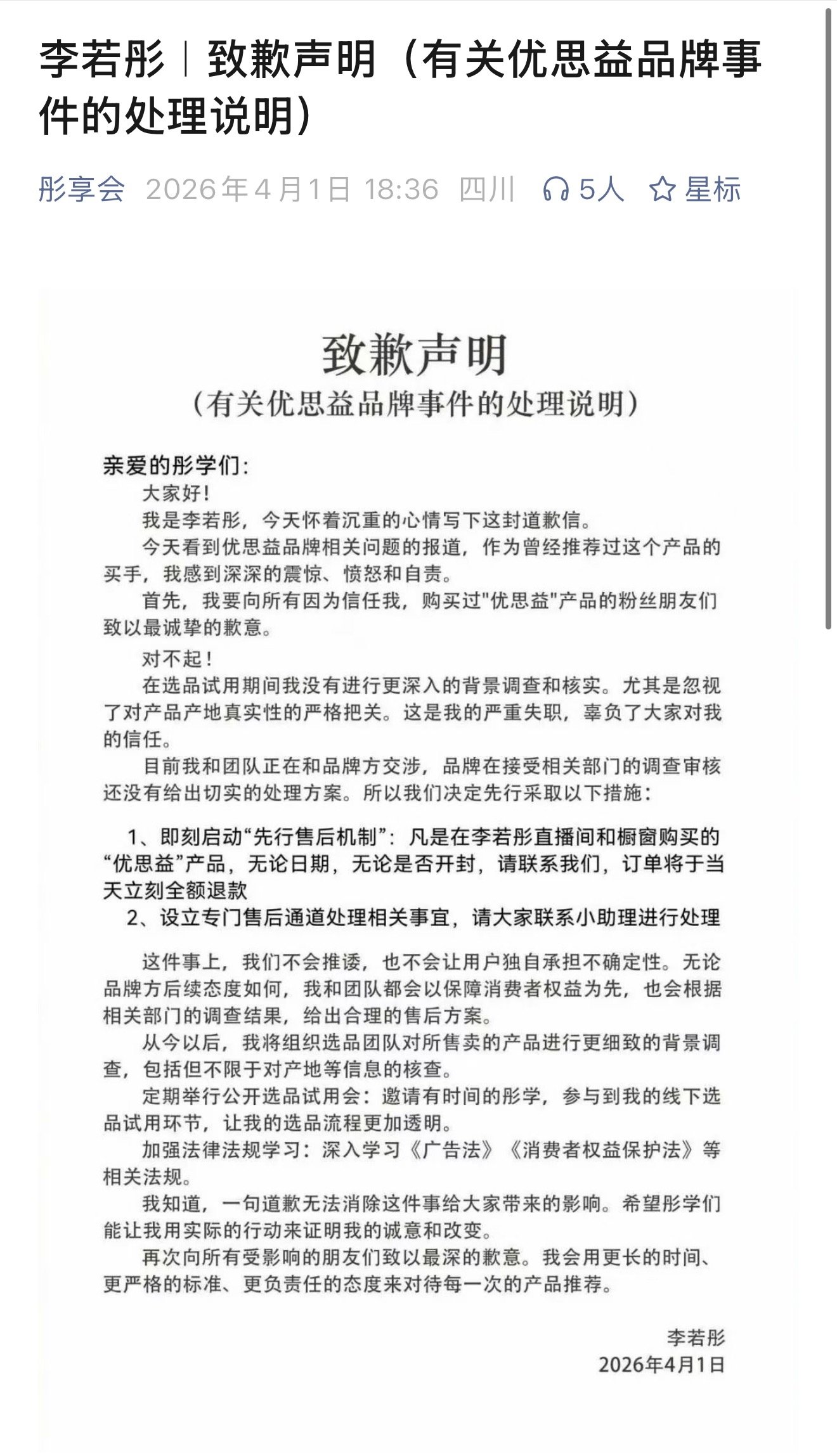 4月1日晚些时候,章小蕙通过其公司账号“玫瑰是玫瑰”发布声明致歉,承诺将以“先行赔付”的形式,于订单核实后的7个工作日内,针对所有通过其相关渠道下单的用户进行退款处理。随后,李若彤直播间官微“彤享会”也发布致歉声明并即刻启动“先行售后机制”,表示:“凡是在李若彤直播间和橱窗购买的‘优思益’产品,无论日期,无论是否开封,请联系我们,订单将于当天立刻全额退款。”