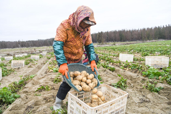 工人将土豆倒入塑料筐。