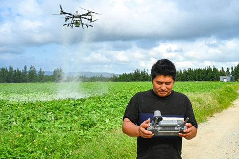 农户陈成华用无人机在幸福洋盐碱地施药。