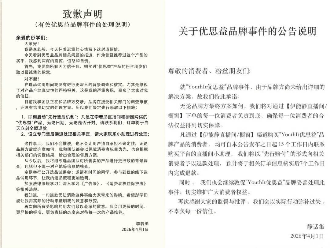 4月1日,李若彤、伊能静发布有关“优思益”的致歉声明。网络截图