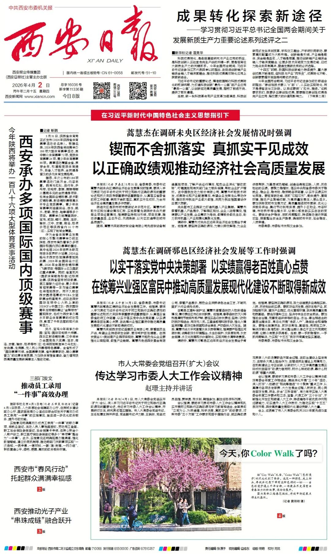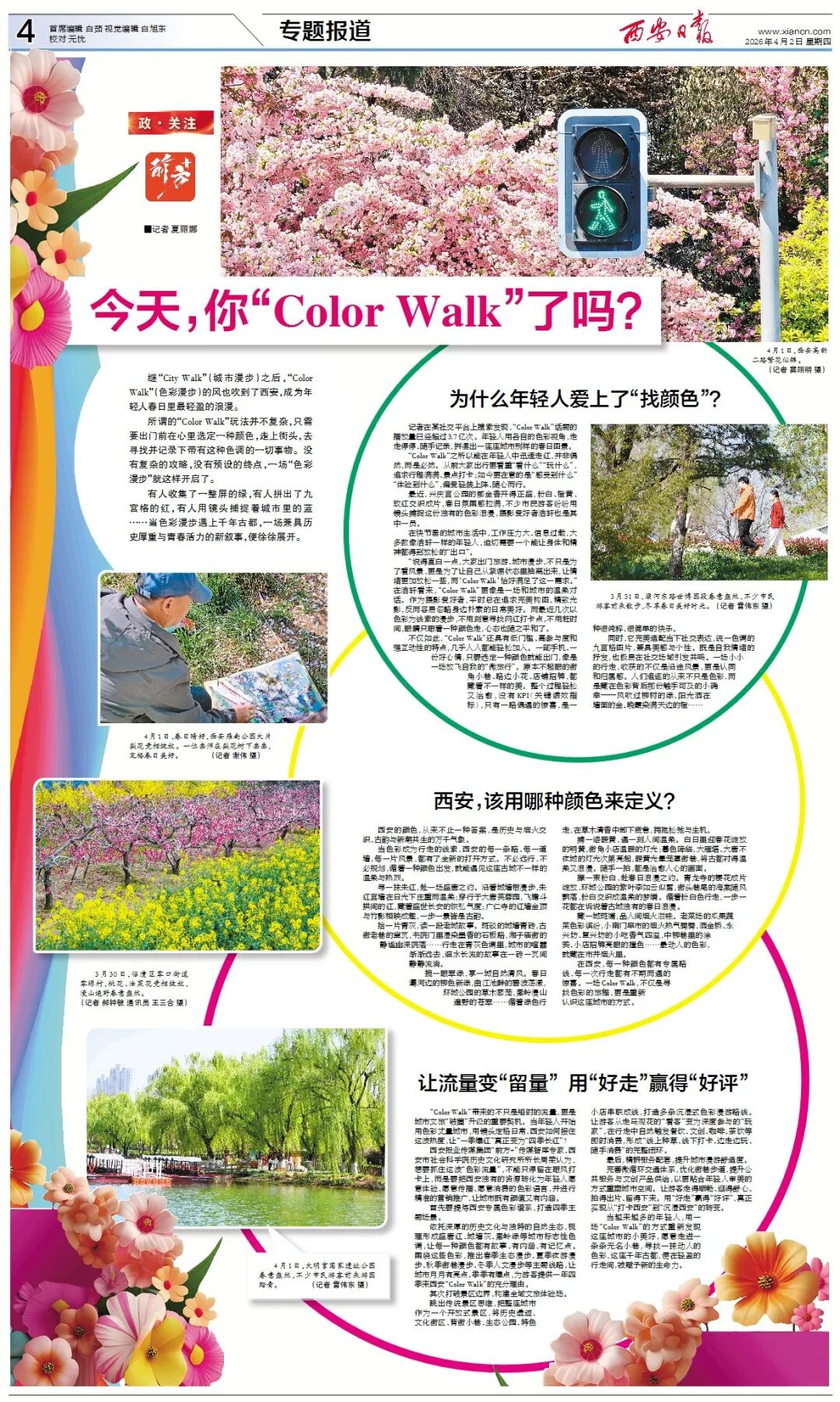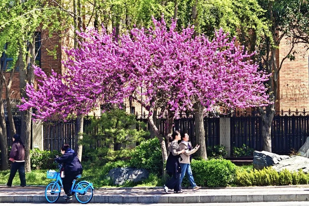 继“City Walk”之后,“Color Walk”(色彩漫步)的风也吹到了西安。选定一种颜色,走上街头,寻找并记录下带有这种色调的一切……当色彩漫步遇上千年古都,一场兼具历史厚重与青春活力的新叙事,便徐徐展开。图为高新二路春花绽放,将城市街道装点得生机盎然。(西安报业全媒体记者 窦翊明 摄)