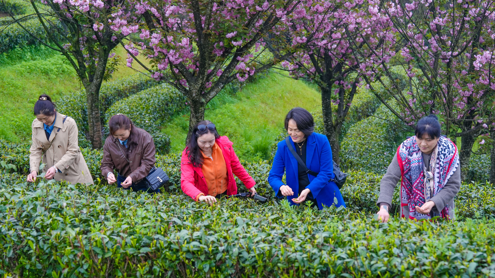 平昌县三十二梁景区,粉嫩的樱花与翠绿的茶垄相映成趣,吸引游客前来体验采茶。