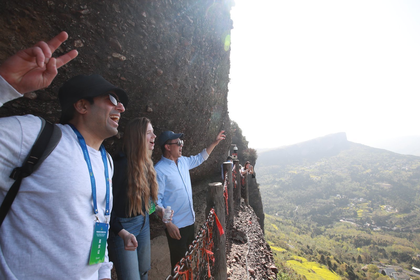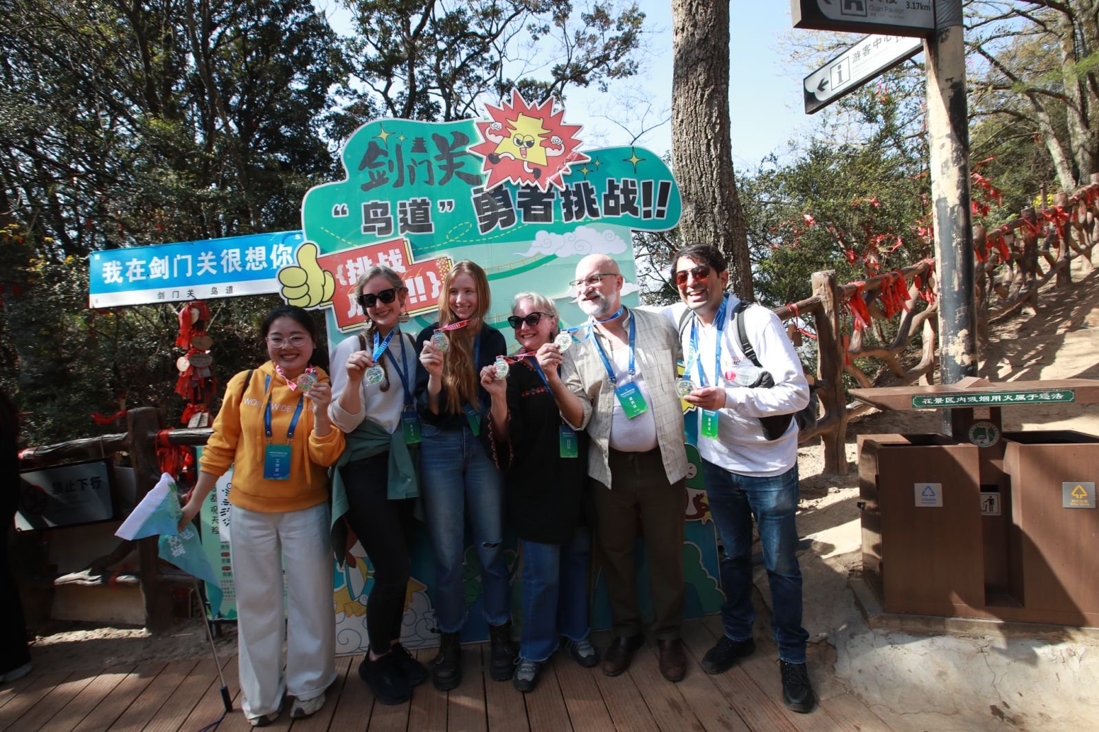 剑门关鸟道上,嘉宾们扶链攀行,时而俯身探险,时而仰头惊叹,彼此轻声鼓劲、相互搀扶。脚下绝壁凌空,眼前云雾漫山,一路赞叹不绝,无不折服于古人凿山开路的非凡智慧。登顶一刻,众人接过纪念奖牌,满脸皆是征服后的畅快与欢喜,快门声此起彼伏,几名外国青年更在山巅齐声诵读《蜀道难》,诗意与豪情回荡山谷。