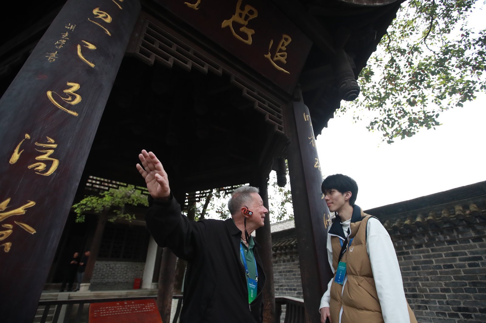 摩根大通银行原副总裁詹姆斯·韦文与中国美国商会华中分会执委会主席卡腾龙在昭化考棚交谈