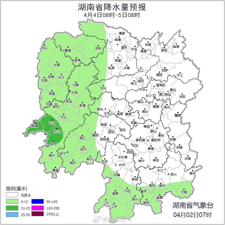 湖南省气象台预计,4月2日至3日白天省内有一次强降雨过程,其中2日晚为最强时段,湘中以南有大到暴雨,局地大暴雨,并伴有短时强降水、雷雨大风、小冰雹等强对流天气;3日晚至4日全省以晴天间多云为主,夜间至清晨大部分地区有雾。