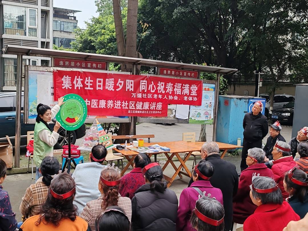 3月31日上午,成都市温江区万盛社区逸然居小区内,老人围坐在一团,笑意盈盈。与往常的集体生日会不同,这次现场多了一张摆放着穴位模型、养生锤和血压计的长条桌。原来,这是温江区柳城街道社区卫生服务中心的家庭医生团队把“中医养生课”搬到了生日会现场。