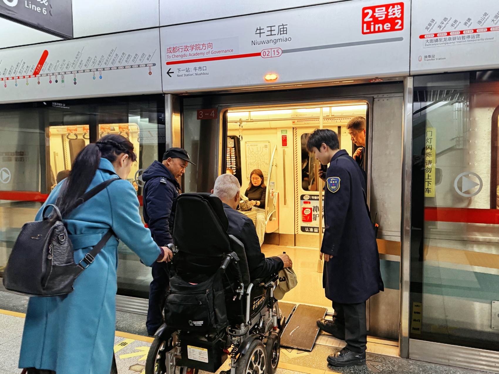 成都地铁工作人员使用无障碍渡板帮助轮椅乘客上车。