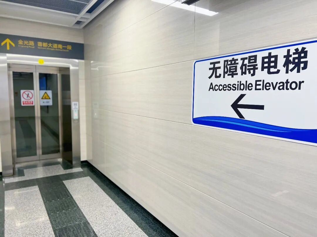 成都地铁站出入口通道的无障碍电梯及导向标识。
