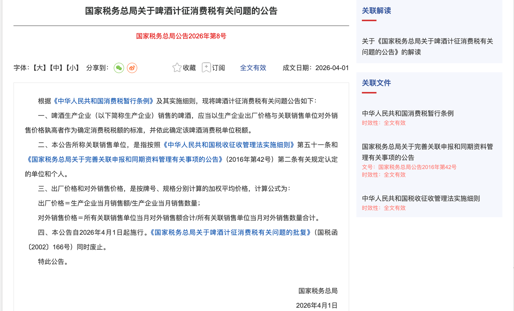 国家税务总局关于啤酒计征消费税有关问题的公告自2026年4月1日起施行。新规明确,啤酒消费税计税依据由此前的“仅按关联销售单位对外售价核定”,调整为“以生产企业出厂价与关联单位对外售价孰高计税”,进一步规范酒类行业税收征管。本次发布的政策实施后,原国税函〔2002〕166号文件同时废止。