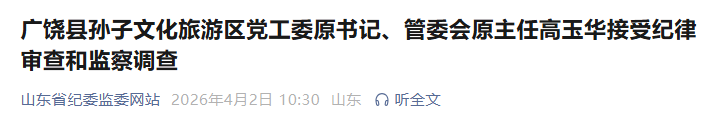据东营市纪委监委消息:广饶县孙子文化旅游区党工委原书记、管委会原主任高玉华涉嫌严重违纪违法,目前正接受东营市纪委监委纪律审查和监察调查。