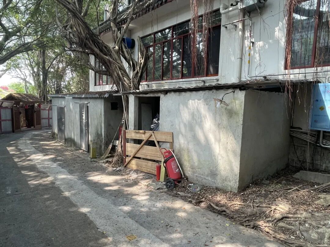 记者在现场看到,一家名为“A某d”的酒吧在原建筑基础上用钢材和水泥外扩的部分,并未拆除;那栋挂牌茶学院的建筑顶部,用钢材扩出的空间依然悬在头顶,锈迹明显的钢梁与原徽派建筑风格格格不入;写有“花开终南”牌匾的建筑旁,那座约15平方米、仅靠钢材支撑的临时建筑仍在,屋顶开裂、脱落的瓦片尚未修复,建筑外部杂乱的电线依旧从地面经排水沟铺设而过。