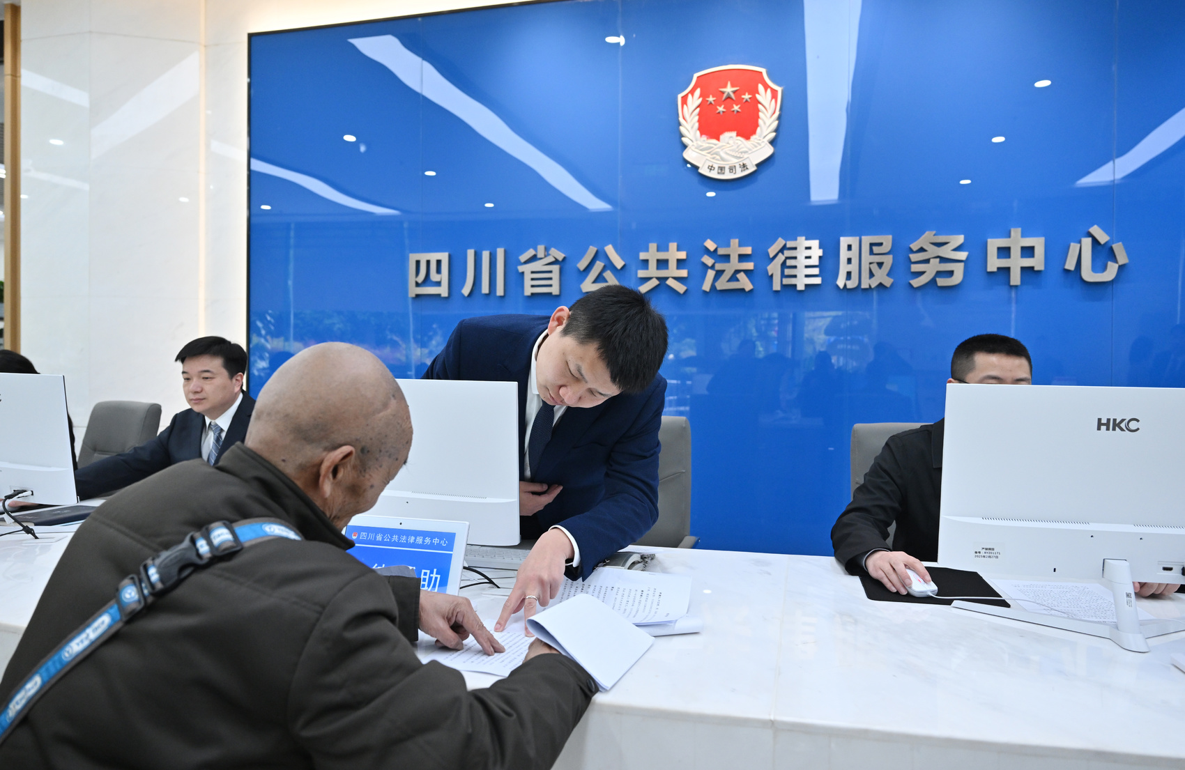 四川省公共法律服务中心工作人员正在解答群众问题。