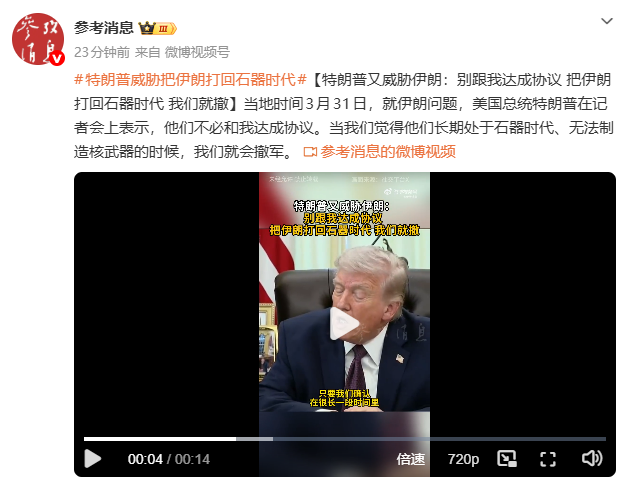 当地时间3月31日,就伊朗问题,美国总统特朗普在记者会上表示,他们不必和我达成协议。当我们觉得他们长期处于石器时代、无法制造核武器的时候,我们就会撤军。