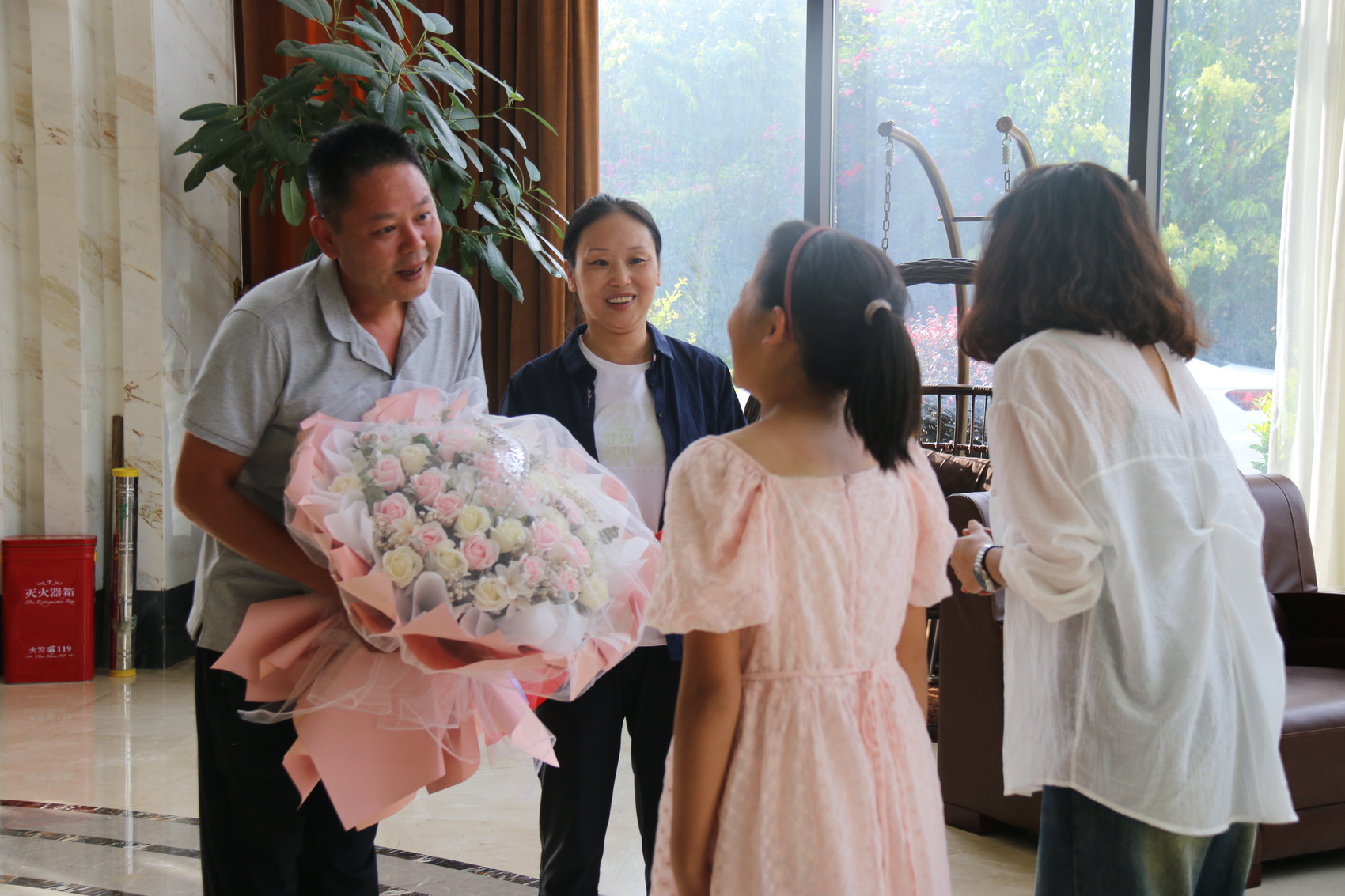 2023年8月,黄忠凯在休假期间跳入深湖勇救落水者,落水者家属为其送来鲜花。受访者供图