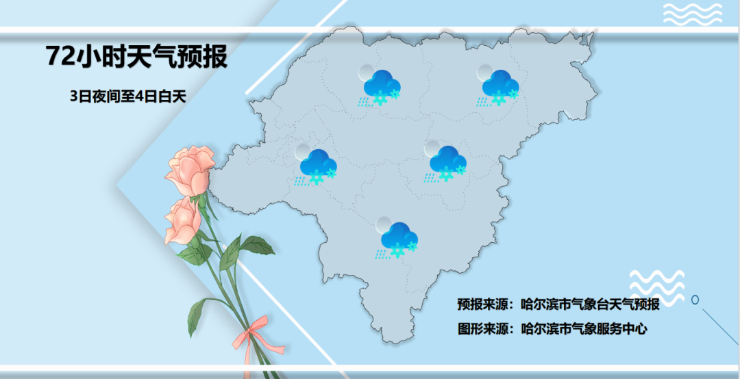 3日夜间到4日白天:黑河东部、伊春、绥化、大庆、哈尔滨东部、鹤岗阴有小雪或雨夹雪,哈尔滨西部、佳木斯、双鸭山、七台河、鸡西、牡丹江阴有雨夹雪或小雨,其中鹤岗、佳木斯东部局地有中雨夹雪,其它地区多云。