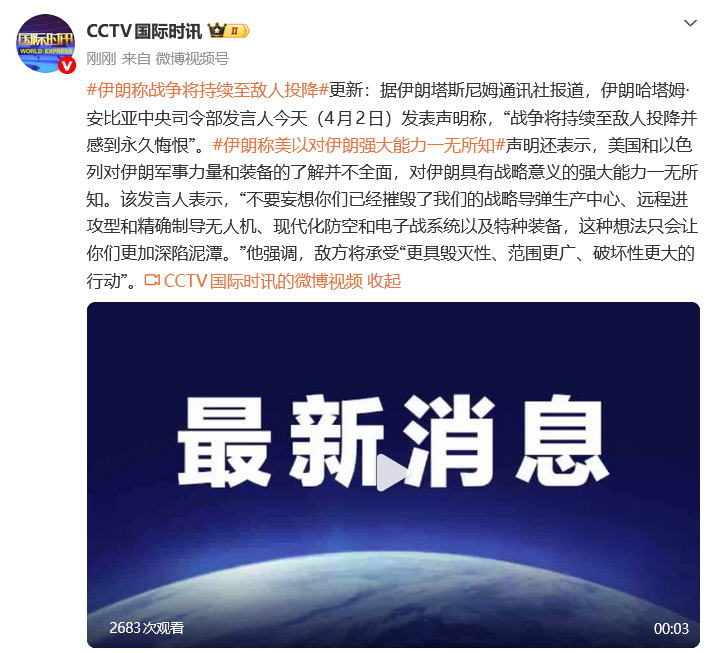 据伊朗塔斯尼姆通讯社报道,伊朗哈塔姆·安比亚中央司令部发言人今天(4月2日)发表声明称,“战争将持续至敌人投降并感到永久悔恨”。