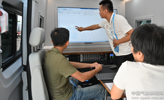 气象工作人员在气象应急保障车中研判天气情况。图/董晨杰