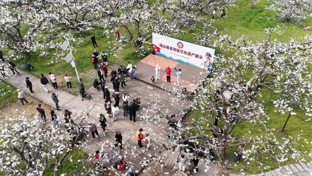 3月31日,砀山县良梨镇梨树王景区,游客们在观赏砀山非遗展示。