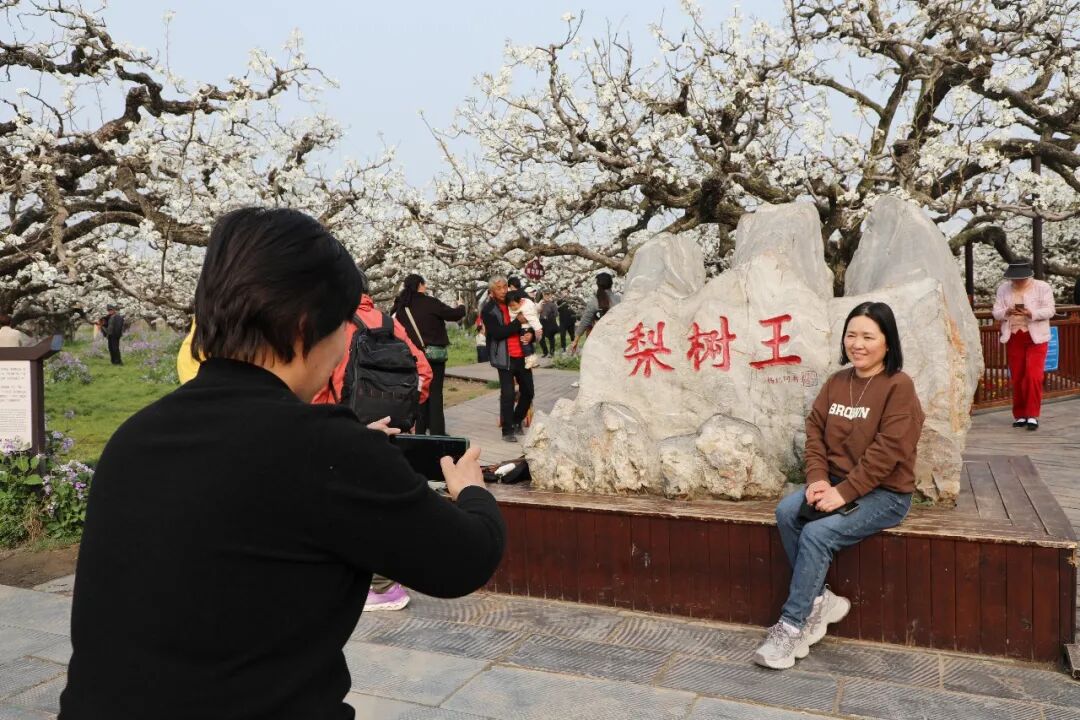 3月31日,砀山县良梨镇梨树王景区,游客们在拍照打卡。