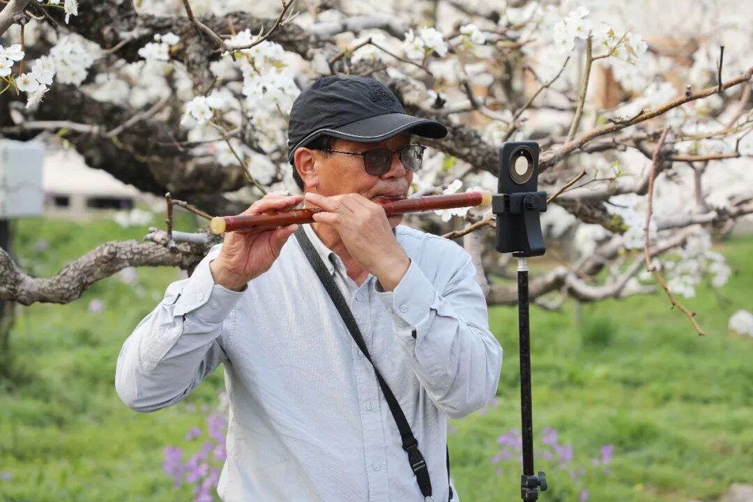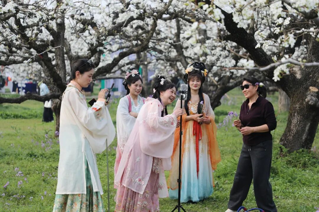 3月31日,砀山县良梨镇梨树王景区,游客在展示才艺。
