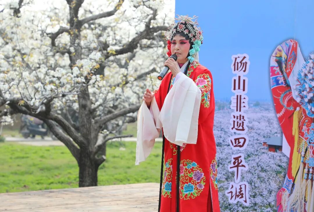 3月31日,砀山县良梨镇梨树王景区,戏曲演员在表演。