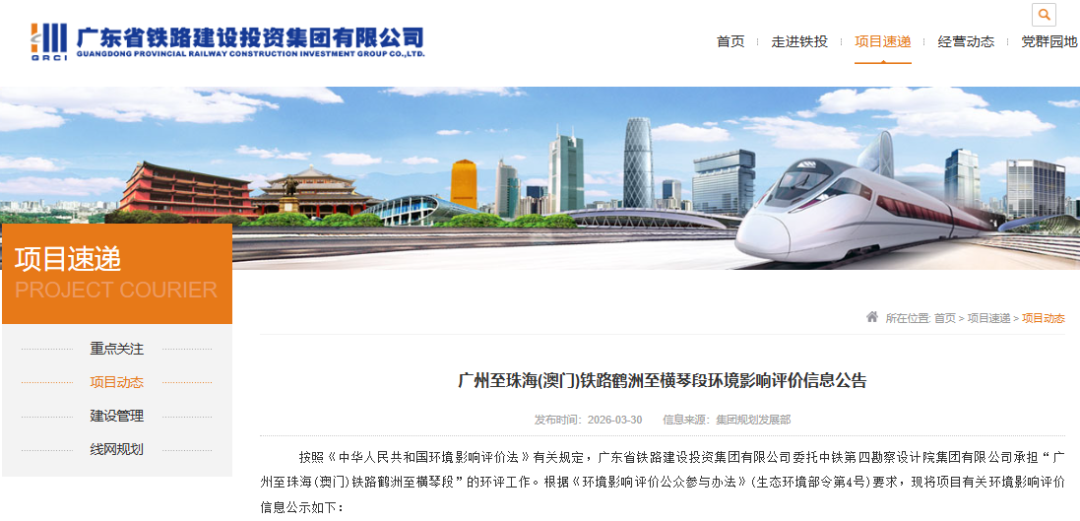 3月30日,广州至珠海(澳门)铁路鹤洲至横琴段环境影响评价信息公告发布。