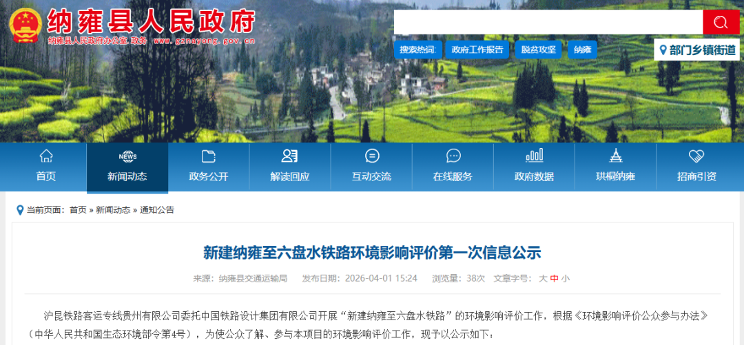 4月1日,新建纳雍至六盘水铁路环境影响评价第一次信息公示发布。公示显示: