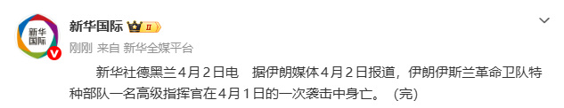 新华社德黑兰4月2日电据伊朗媒体4月2日报道,伊朗伊斯兰革命卫队特种部队一名高级指挥官在4月1日的一次袭击中身亡。