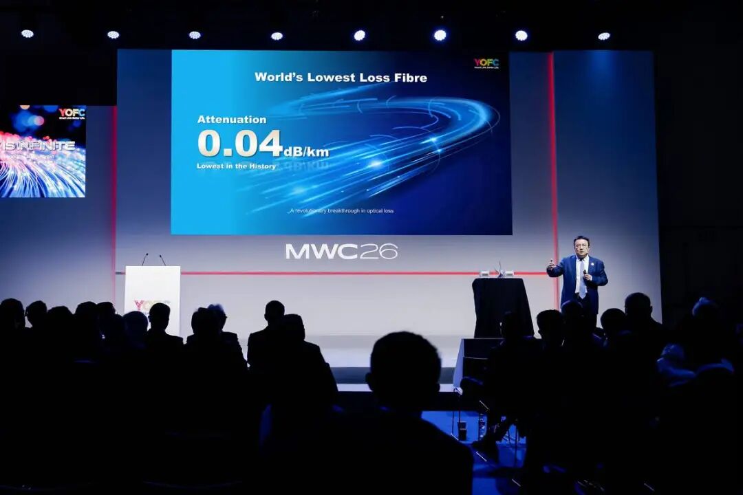 2026年世界移动通信大会(MWC2026)上,长飞光纤发布全球最低衰减0.04dB/km空芯光纤。