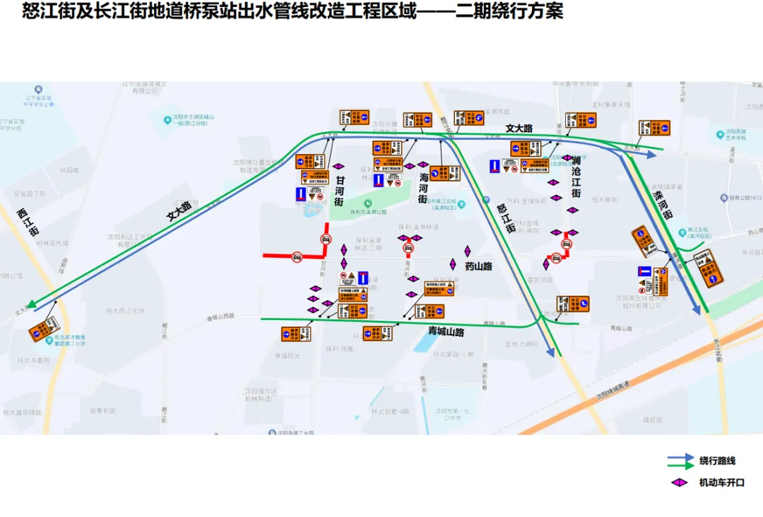 1.将封闭药山路甘河街口机动车交通,路口仅保留南向东转向通行。