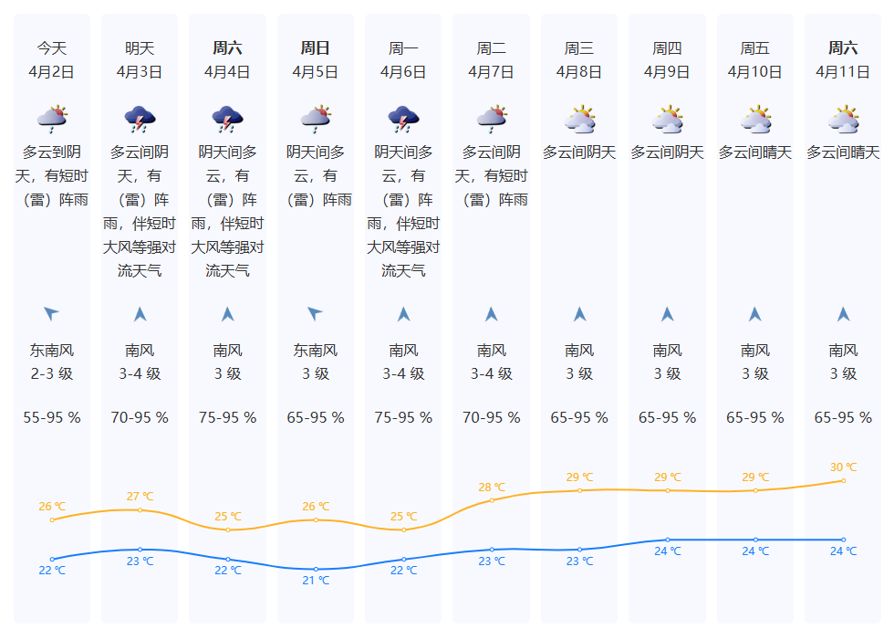 预计4月2日多云到阴天,有短时(雷)阵雨;