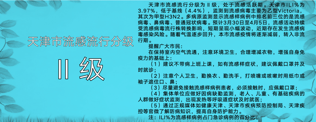 天津市ILI%为3.97%,低于基线(4.4%),监测到流感病毒主要为乙型Victoria,其次为甲型H3N2。多病原监测显示流感样病例中排名前三位的是流感病毒、鼻病毒、普通冠状病毒。预计3月30日至4月5日,流感活动持续受流感病毒流行株转换影响,短期呈现小幅波动,近期存在发生流感病毒感染风险。随着气温逐步回升,本市流感疫情将逐渐减弱,转入非流行期。