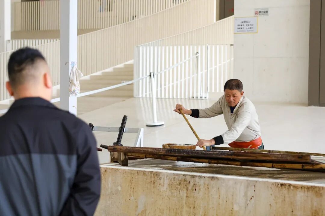 走进以“纸山”为设计灵感的白色建筑群,游客的身影随处可见。非遗技艺展示区内,工匠们现场演示宣纸制作的“捞、晒、剪”等关键工序,引得观众驻足赞叹。一位带孩子参观的游客表示:“今年春晚合肥分会场的节目令人震撼,尤其是三丈三宣纸的制作场景。春假特地来这儿,让孩子了解宣纸的起源与技艺,这是一堂生动的传统文化课。”