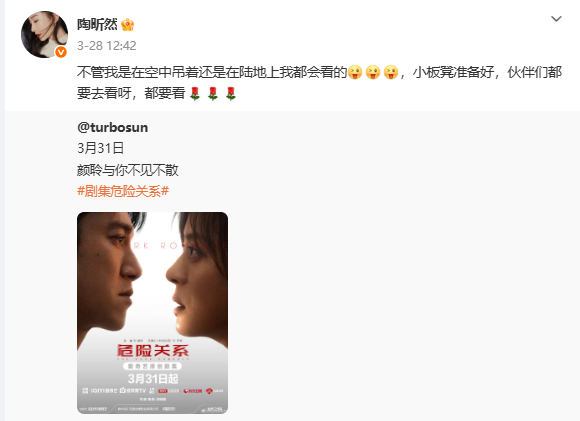 此前,演员斓曦、陶昕然也发文支持孙俪新剧,陶昕然幽默配文:不管我是在空中吊着还是在陆地上我都会看的