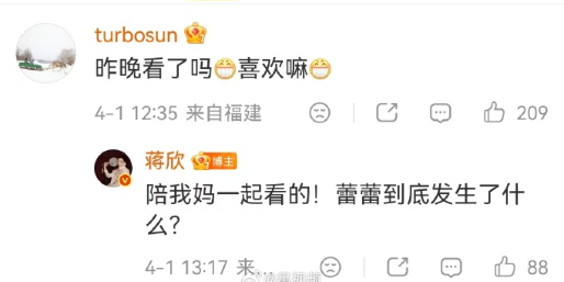 4月1日,孙俪回应蒋欣,并问“昨晚看了吗?喜欢嘛”,蒋欣表示陪妈妈一起看的!两位娘娘也是梦幻联动上了~ 有网友称:甄嬛与华妃的“大和解”来了。