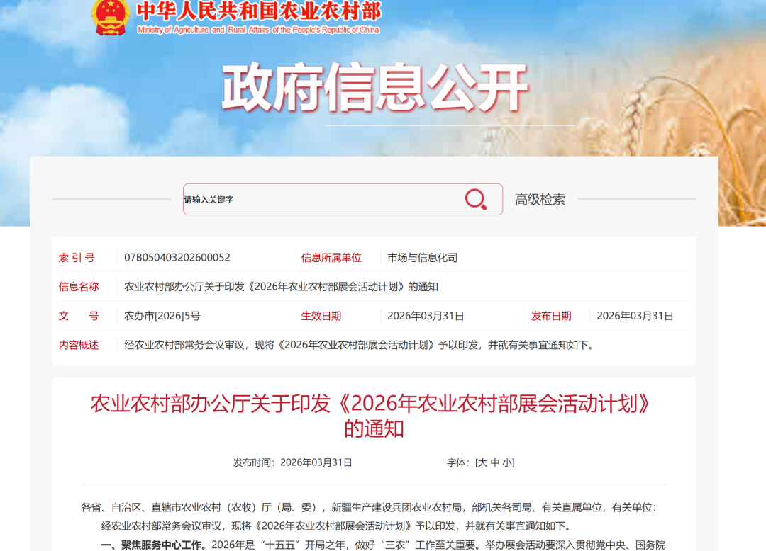 经农业农村部常务会议审议,现将《2026年农业农村部展会活动计划》予以印发,并就有关事宜通知如下。