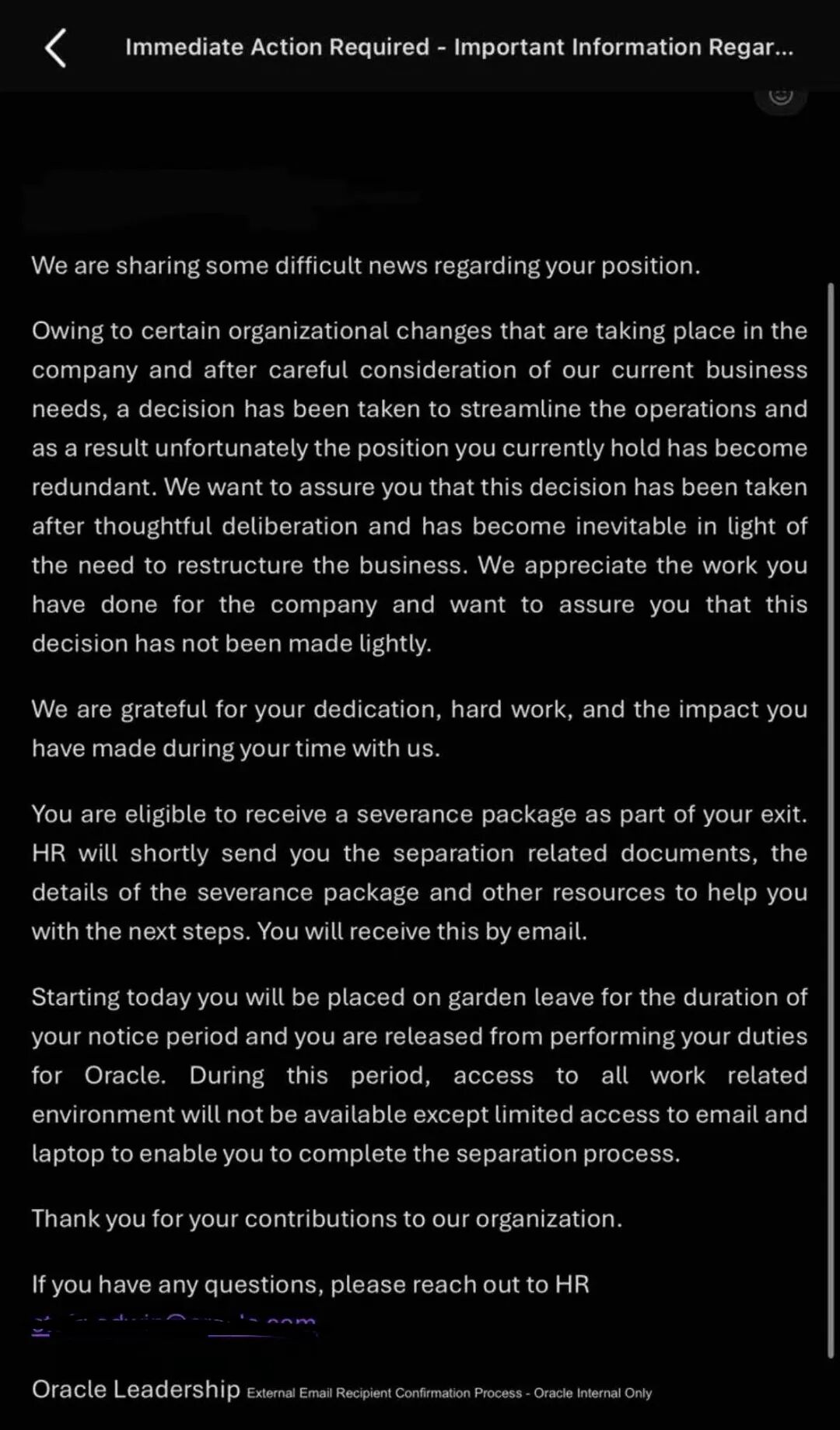 甲骨文一不具名华人员工接受中国侨网采访时表示,此次裁员以极其突然的方式执行。裁员通知于美国西部时间凌晨 3 点、中部时间 5 点、东部时间 6点群发邮箱。邮件发出同时,被裁员工的公司邮箱、内部系统、门禁权限被立即切断,无任何事前沟通、一对一谈话或工作交接缓冲期。