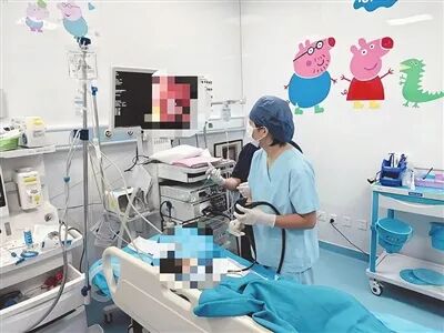 事发当日,患儿玥玥突然呛咳不止、不爱吃饭,警惕的宝妈火速带娃就医。青岛市妇女儿童医院耳鼻喉科医生仔细检查后,分析可能是食管中有异物。经过急诊CT检查,确定患儿食管内存在异物嵌顿,需要尽快取出。回忆起当天曾给孩子喂过鱼汤,玥玥的妈妈瞬间慌了神。经综合考虑孩子的年龄、病情,最终决定由消化科医生通过内镜取出异物。