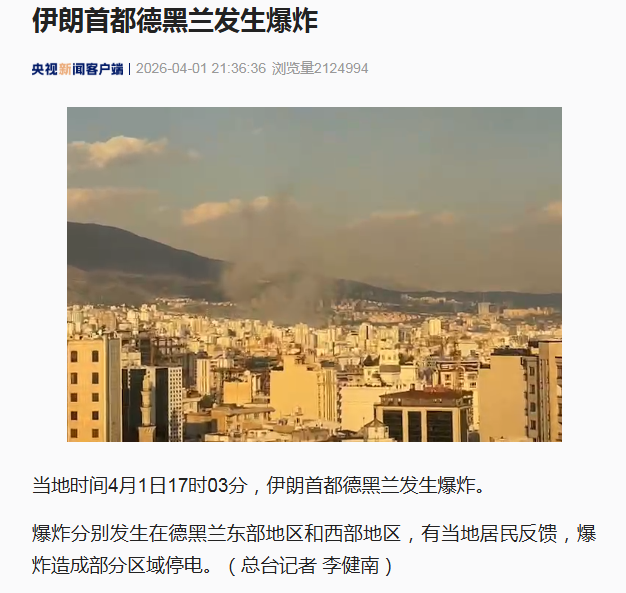 据央视新闻客户端消息,当地时间4月1日17时03分,伊朗首都德黑兰发生爆炸。
