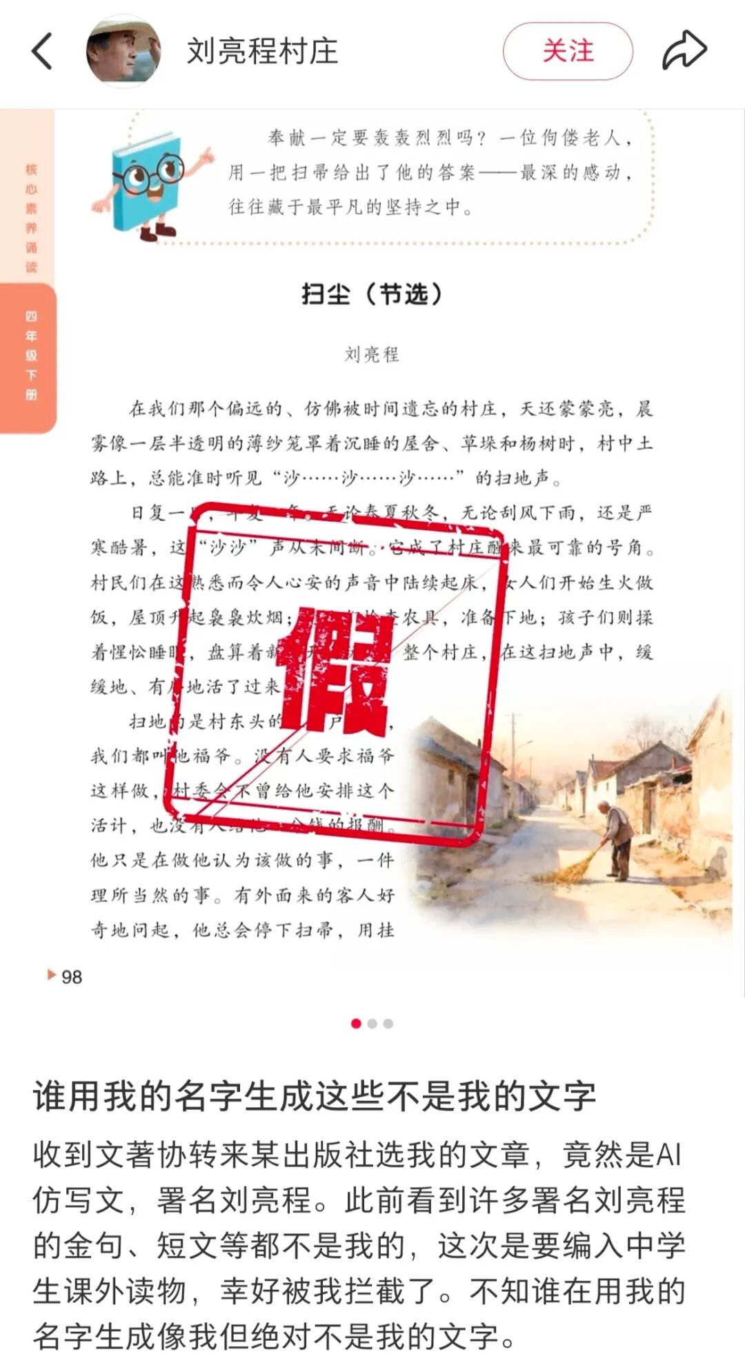 4月1日,作家刘亮程在社交平台表示,他发现某出版社要编入中学生课外读物的署名“刘亮程”文章《扫尘》是“AI仿写文”,并非自己所写,“不知谁在用我的名字生成像我但绝对不是我的文字”。