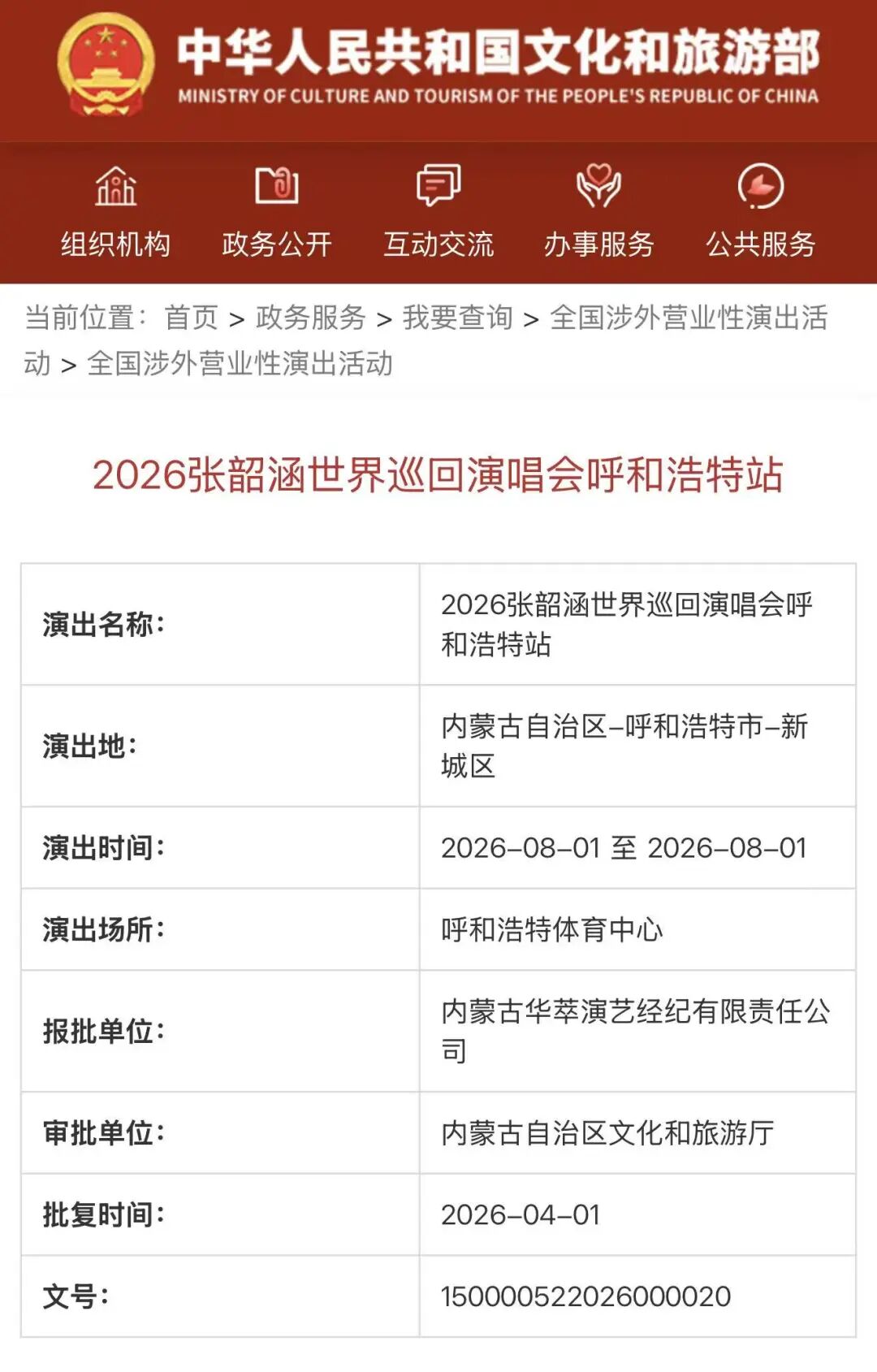 ✅️演出名称:2026张韶涵世界巡回演唱会呼和浩特站